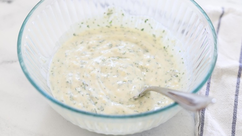 Recipe developer Kit Hondrum says of her blue cheese preparation, "this delicious dressing ... [is] very versatile" and suggests that it can be served as a dip or on a salad. If you choose to use it for the latter, though, you may want to mix in some additional lemon juice or a little white vinegar to thin it out a bit. Hondrum offers one additional suggestion, saying you can also bake it with shredded cheese on top — she favors Parmesan — before serving it as a hot dip with chips or crostini.