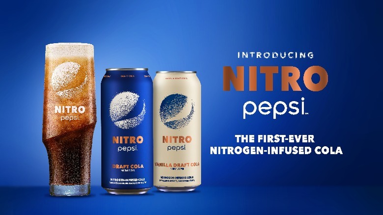 If a type of beverage has been around for more than 100 years, it may be challenging to find a way to innovate so that its taste and mouthfeel might appeal to a new generation of drinkers. But Pepsi says it may have found a way to do just that with its latest drink, Nitro Pepsi, which will be released to the general public on March 28. In a press release sent to Tasting Table, PepsiCo calls this soda the "first-ever nitrogen-infused cola that's actually softer than a soft drink — it's creamy, smooth, and has a mesmerizing cascade of tiny bubbles topped off by a frothy foam head."