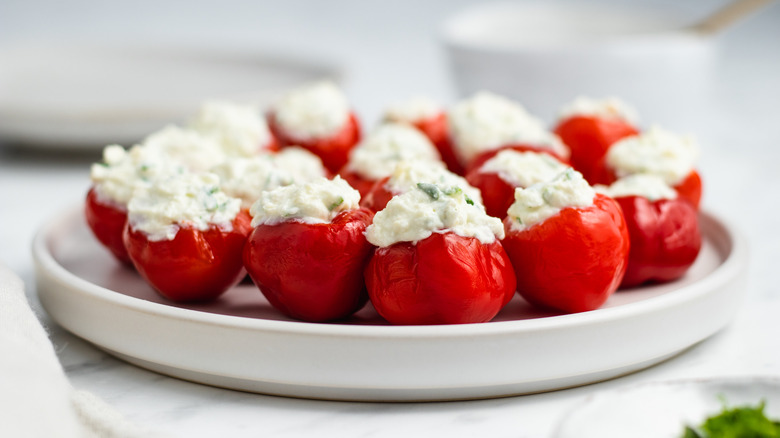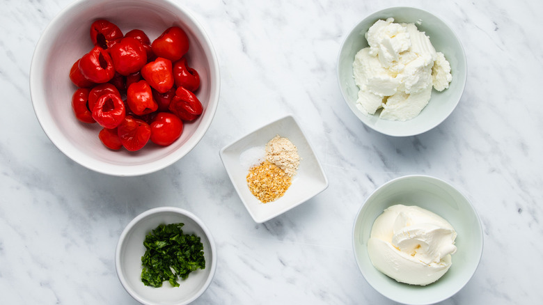 Stuffed cherry peppers are often made with a variety of ingredients, including provolone, prosciutto, and anchovies. This recipe keeps it really simple — you'll only need cherry peppers, ricotta cheese, cream cheese, and a few pantry staples.