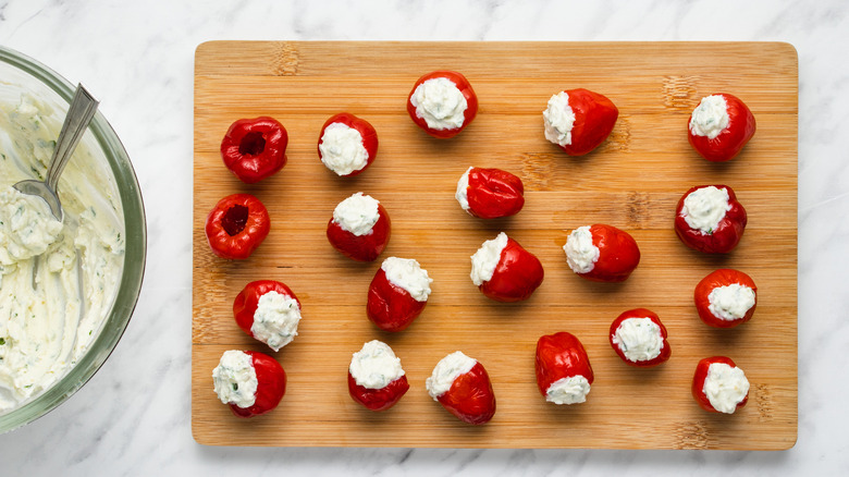 Now that you've made the cheese filling, it's time to stuff peppers. Using your fingers or a small spoon, stuff the peppers with the cheese mixture. Each stuffed pepper should have a little filling spilling out of the top of the pepper. If you're a stickler for neatness, or you're working with smaller peppers, you could also use a piping bag to get the filling into the peppers. Regardless of how you're getting the cheese mixture into the cherry peppers, don't overthink it! This is a simple recipe.