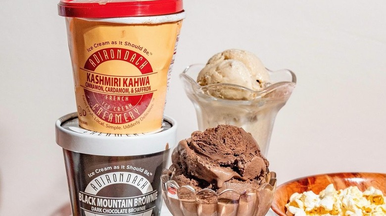 Founded in New York, the Adirondack Creamery sources its ice cream base, made up of cream, milk, sugar, and egg yolks from family farms. The company is committed to its mission of using simple ingredients and sourcing locally to provide fresh-tasting ice cream. Some of the flavors include Peppermint Stick and Egg Nog, which gives you a scoop of the holidays all year long. While the company also offers standard flavors like vanilla and chocolate, Adirondack Creamery's High Peak Perk is arguably considered one of the best coffee ice cream flavors thanks to its taste, aroma, and texture. The ice cream contains ground coffee beans, and coffee flakes that will provide the ideal java fix to anyone who missed their morning cup of joe.