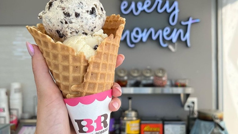 Baskin Robbins may be known for 31 flavors, but over its 75 years of business, the company has rotated more than 1,400 flavors throughout its ice cream lineup. Some customers have go-to flavors like the Jamoca Almond Fudge, which offers a coffee-based ice cream with a chocolate-flavored swirl and almonds, Pistachio Almond, or Oreo Cookies 'n Cream. Although the brand has countless flavors, it has a limited non-dairy selection. Baskin Robbins also has a variety of other frozen treats and ice cream cakes that easily become the center of attention at any celebration.