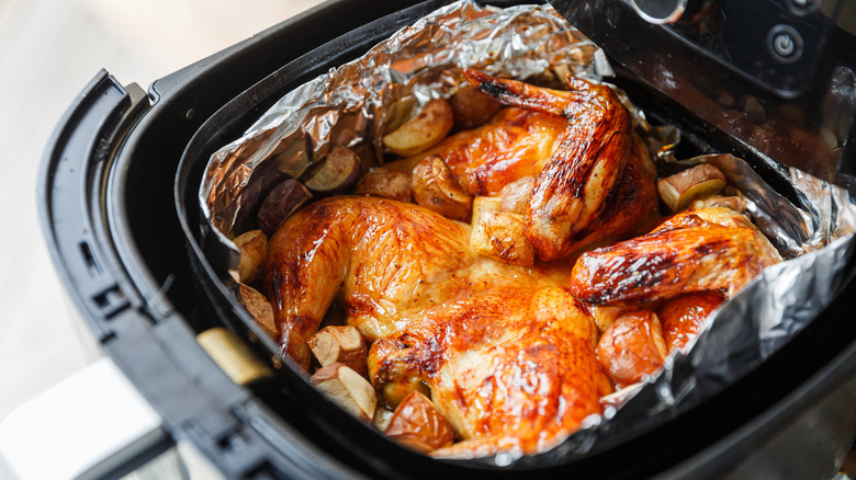 Another important thing to note when using foil — whether in an air fryer or an oven — is to be careful about using acidic foods on top of it. Using foil while cooking anything can allow small amounts of aluminum to seep into food (via USA Today). This is generally harmless by health standards as aluminum is naturally occurring in virtually everything. However, according to Food & Nutrition, acidic foods like tomato sauce and vinegar are so strong they can damage the foil and cause it to seep through in larger amounts, which can negatively impact the taste of a meal.