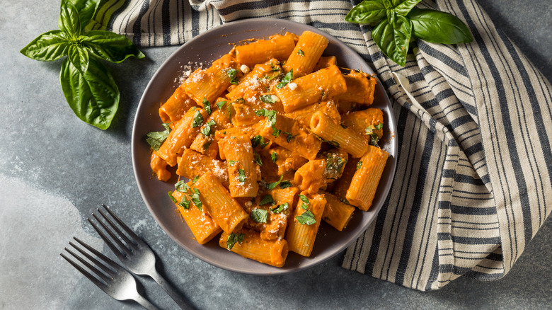 And then there's the world of creamy tomato sauces: Italian cooking doyenne Marcella's Hazan's famous butter tomato sauce, ricotta tomato sauce, and, of course, the most famous of all creamy tomato sauces: vodka sauce. Although the name might imply a heavily boozed-up, astringent type of sauce, vodka sauce is just a basic tomato sauce enriched with cream. It boasts a small amount of the distilled spirit, whose role is to increase the sauce's aroma and help emulsify the cream and tomatoes (via Paesana). A good vodka sauce is simmered after adding the vodka, cooking off the majority of the spirit and leaving just a hint of its sharp flavor, according to Serious Eats. But since there is alcohol in the finished dish, is it possible to get drunk on vodka sauce?