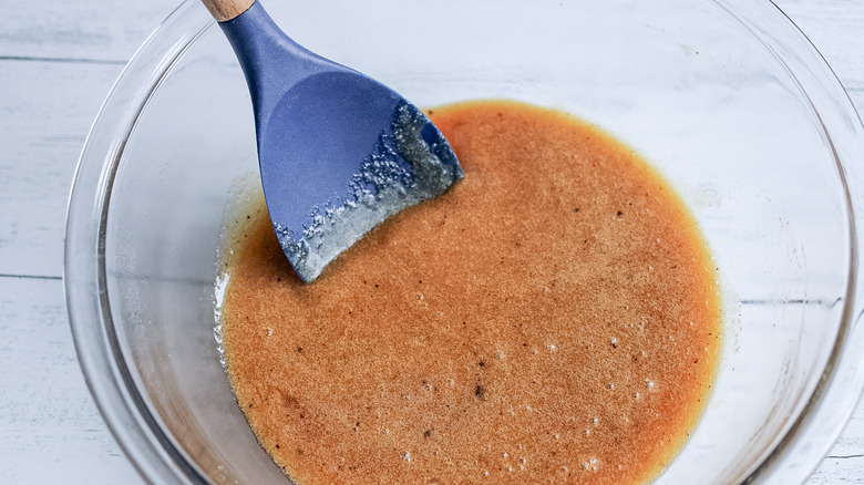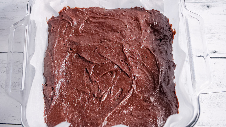 With all the ingredients well-combined, pour the contents from the bowl into the prepared pan. Set the timer on your oven for 22-25 minutes, and bake until the center of the brownies is set. "If you want [the] brownies to be really fudgy, then you [should] take them out of the oven when the center is set, but has a slight jiggle," Morone notes. "If you want them to be more cakey, then cook them until a toothpick inserted into the center of the brownies comes out with just a few crumbs on it."