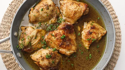 Skip the boring chicken breasts and opt for this juicy recipe for pan-fried chicken thighs. It only takes 35 minutes to make and pairs well with any side dish.