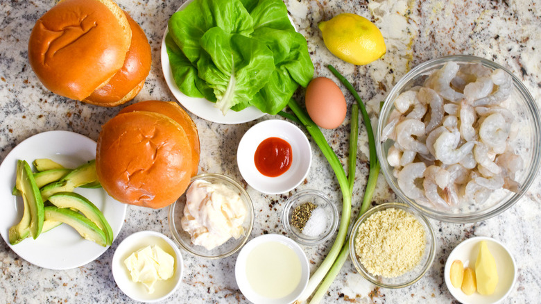 Since you need shrimp to make a shrimp burger, pick up a pound of medium shrimp without tails that have been peeled and deveined. In the vegetable aisle pick up a lemon, two garlic cloves, and two green onions, as well as fresh ginger, and finally some butter lettuce. In the bakery department pick up four brioche buns. Moving on to herbs and spices, you need a container of panko breadcrumbs (you'll need 1/3 of a cup). You also need a little bit of kosher salt and some freshly-ground black pepper, so pick that up if you don't have any at home.