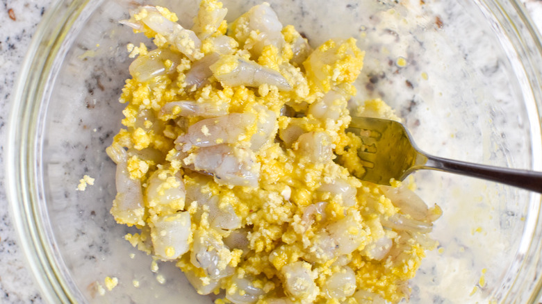 You can start by combining the mayonnaise and sriracha in a bowl, though you will set that aside for the very end. Next, coarsely chop the green onions into small pieces and set that pile aside as well. Now it's time for more chopping. Chop a half pound of the shrimp into ½-inch pieces and place them in a medium bowl. Again, you really want to make sure there is no shell. Add the egg and panko to the shrimp and mix with a fork until combined. Be careful not to break up the shrimp pieces. "You can refrigerate this mixture," Rapone says, "but it won't go bad at room temperature in the time it takes to complete the other steps." That also means that if you want to make this mixture in advance and refrigerate it, you can do so.