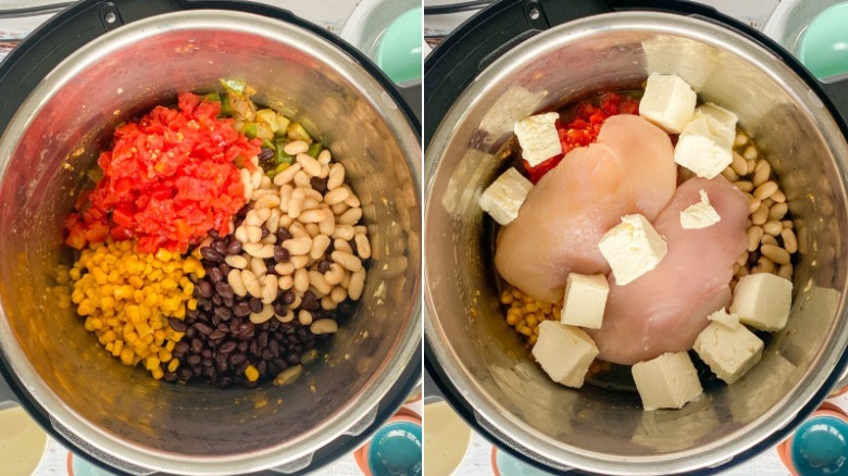 Do make sure to drain the beans in a colander before adding them. Then add the diced tomatoes and the corn. The boneless chicken breasts go on top of that, along with chicken broth. But before we send these ingredients off to mingle under pressure, we're going to scatter small cubes of cream cheese over the whole thing and let it do its thing.