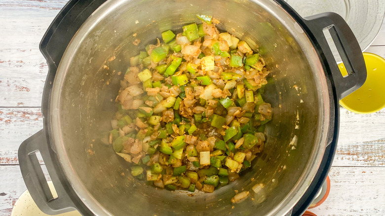 Turn the Instant Pot to its sauté function, and set the temperature to medium. Pour in the olive oil, and wait for it shimmer. Then add the chopped onion and cook until slightly softened (no more than three minutes or so). To this, add the minced garlic, and stir for one minute. Then add the chopped celery, bell pepper, and jalapeño, and continue to sauté, stirring regularly, until all the vegetables are soft (no more than about five more minutes).