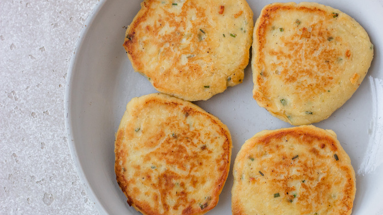 Speaking of your liking, you can really take these Irish potato cakes in any number of ways, from the sweet to the savory. As Shelbert explains: "These parallel with your favorite Irish dish or alongside sauerkraut or any other cabbage dish. Popular toppings include sour cream, applesauce, caramelized onions, or savory jams." Frankly, these potato cakes are so tasty that you may find yourself preparing mashed potatoes just to let them cool and serve as the basis for the recipe. A better idea is just to make a double batch of mashed potatoes for dinner tonight to be assured that you have the primary ingredient needed for these cakes at the ready the next day.