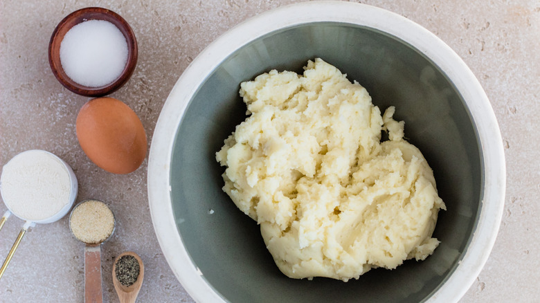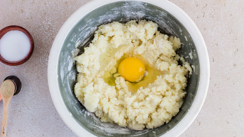 Start the recipe off by combining the potatoes with flour in a mixing bowl. Start with just ⅓ cup of flour, then add the salt and pepper and lightly mix these ingredients with a spoon to combine them. Next, make a well in the center of the mixture, crack the egg into the well, and whisk it. Fold the egg into the potato mixture.