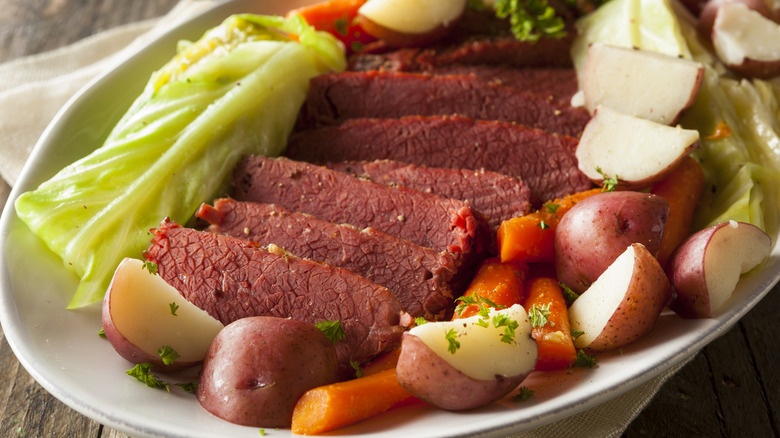Many culinary historians point out that while corned beef is often associated with Irish culture, it is, in fact, a Jewish dish, which became popular with the Irish-American immigrant community (via The Nosher). The salted beef was paired with affordable, hearty vegetables — like potatoes, carrots, cabbage, and turnips — for a cheap, filling meal that could easily feed a whole family.
