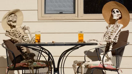 It's easy to see why some of us might believe that the idea of hosting or attending a "skeleton brunch" is actually trending in the social media sphere. A search with the term "skeleton brunch" on Twitter yields a collection of posts, including photos of Halloween skeletons enjoying a chill weekend meal. There's a solo skeleton enjoying a mimosa, or groups of skeletons doing different things: posed before a variety of breakfast items or being served by a skeleton servant. There's even an image of skeletons ordering a round of drinks "We'd like bottomless mimosas — and a mop! *hollow clicking laughter*" reads the caption.