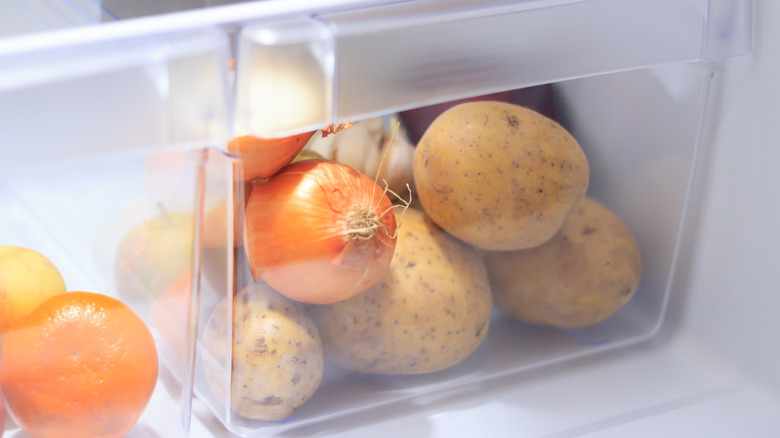 You may be used to piling your fresh vegetables into the crisper drawer after a trip to the farmer's market, but you should stop and think before doing the same with your potatoes. According to Southern Living, potatoes just don't keep well in the fridge. They actually last longer at somewhat warmer temperatures as long as they're in a cool, dark, and dry environment. Think 50 degrees, as opposed to a typical fridge's 35 to 38 degrees. If you don't have a pantry, you can dedicate a cupboard or drawer located in a cooler part of your kitchen to potato storage, suggests Food52.