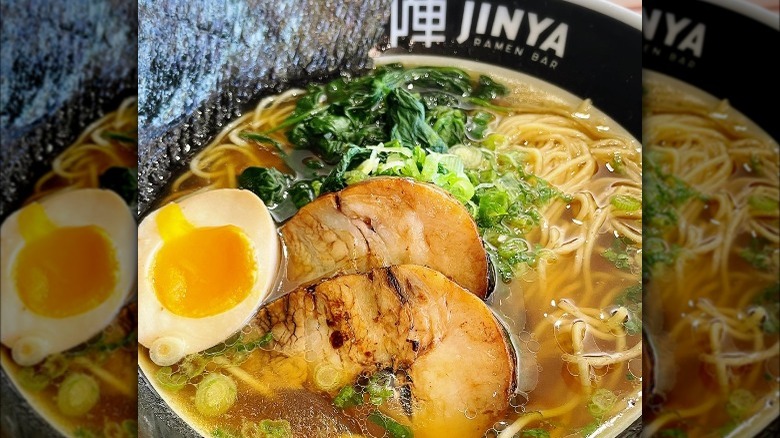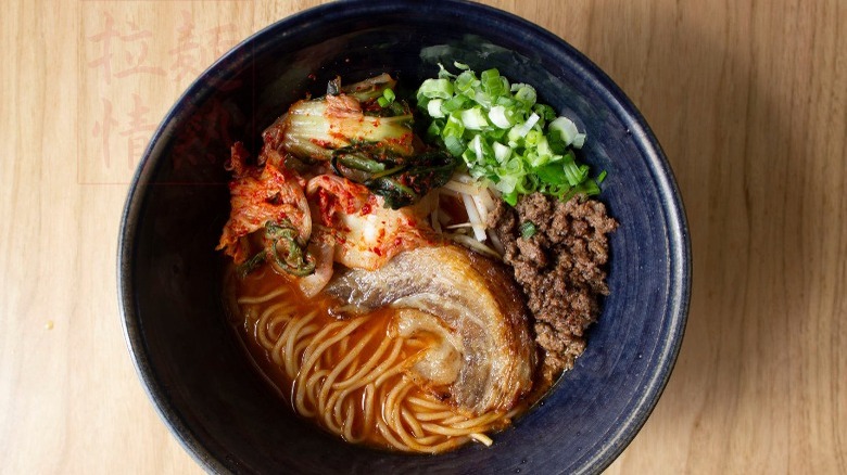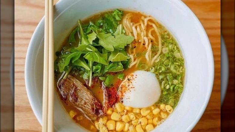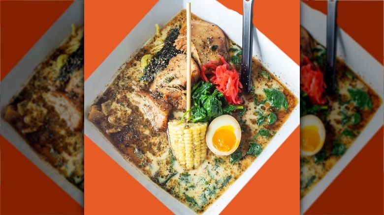 Uncle offers some unique ramen options that you probably haven't seen so far on this list. The broth is a combination of chicken and pork, and some dishes have a white shoyu base while others are made with sesame. Popular menu items include the chili pork ramen (which made with ground pork, kimchi, poached egg, sesame seeds, and scallion) and the spicy chicken (which contains confit chicken, bean sprouts, poached egg, sesame seeds, and scallion). A standout dish from Uncle is the duck ramen, which we haven't seen on anyone else's menu thus far. According to Uncle, this ramen comes topped with crispy confit duck leg, arugula, corn, poached egg, Japanese seven spice togarashi, and scallion.