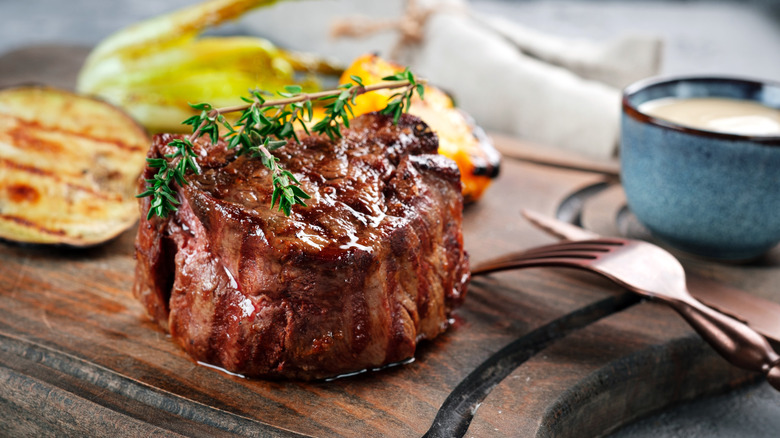Here's the thing — beef tenderloin is one of the leanest steaks available, coming in at less than 7 grams of fat per serving, according to Certified Angus Beef. And when it comes to meat, fat equals flavor. So although the texture of filet mignon might be more pleasing, it definitely registers lower on big beefy flavor than other, fattier cuts of meat you'll find on steakhouse menus. For example, fattier cuts such as a well-marbled ribeye or a juicy New York strip contain more flavor (via Cattlemen's Steakhouse).