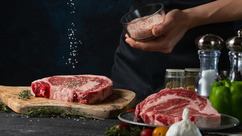 If checking the expiration date qualifies as common sense, so too does using your eyes, nose, and sense of touch to evaluate the condition of your steaks prior to preparation. Per Food Fire Friends, steak that's going bad often looks discolored, appearing brown or gray instead of the healthy red color one would expect. But sight alone may not always be conclusive, so Steak Revolution recommends touching or examining the texture of the steak as well. If it's slimy or slick — or worse yet, moldy — that's a sure sign that the steak is going bad and should be thrown out. Utilizing your sense of smell can also help. If you catch a whiff of something that smells like ammonia, bad news: The steak is definitely spoiled.