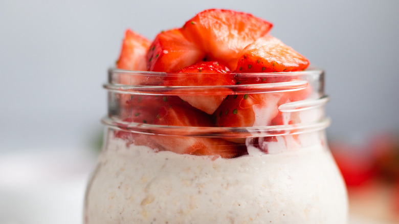 After allowing your jar of oats to sit in the fridge for at least six hours, it's time to enjoy the fruits of your labor — pun intended! Simply pull your jar out of the fridge, open it up, and top with additional chopped strawberries, if you'd like. Or, if you want to add some pizzazz to your overnight oats, you could opt for different toppings. "You could add other fruit toppings, such as banana or blueberry. Or sprinkle some granola, chia seeds, or coconut flakes on top," Brookes suggests.