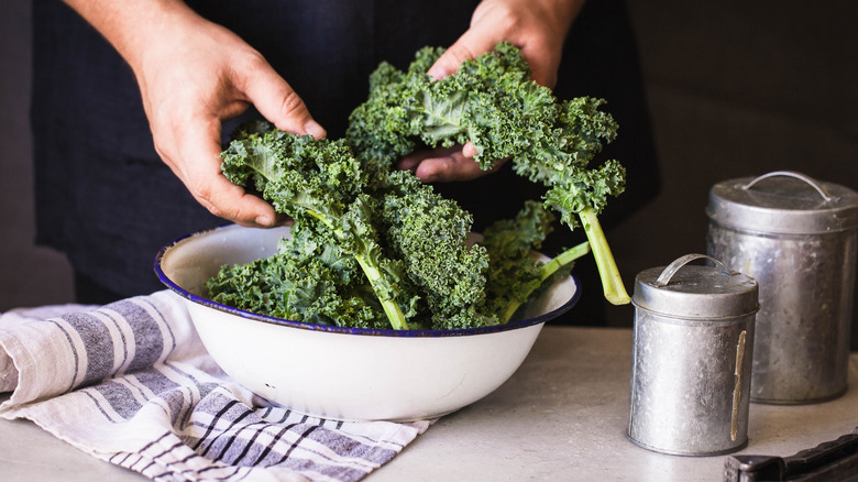 Thanks to its hearty leaves, MasterClass writes that eaters can consume curly kale sauteed, boiled, steamed, or roasted. The site also mentions that curly kale is good to eat raw. If you plan to immediately serve the greens in a salad, Bon Appétit recommends properly massaging the leaves with oil until they start to wilt. This process tenderizes the kale, making it more pleasant and palatable. Regardless of your cooking method, New Entry reports that you'll want to begin by adequately rinsing the leaves since the tight curls are the perfect hiding spot for dirt and bugs. Typically, our sources agree that removing the thick stems is also ideal.