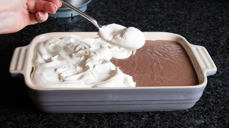 - Whip up the remaining 1 cup of cream until it is thick and holds its shape, then dollop this on top of the set chocolate pudding and swirl it about until it covers the surface of the cookie lasagna.