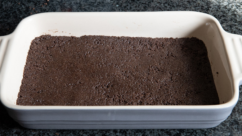 - In a bowl, combine together all but 1 tablespoon of the Oreo cookie crumbs and the melted butter, and mix these together thoroughly, and then press mixture into the base of a rectangular lasagna dish.