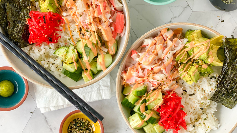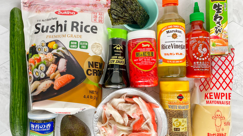 For this recipe, you'll need a few key ingredients that may look similar to those for a sushi roll. You'll need uncooked sushi rice, seasoned rice vinegar, Japanese (AKA Kewpie) mayo, sriracha, and surimi. "Surimi is the technical name for the imitation krab commonly used in California rolls and other sushi," MacLean says. You'll also need some diced cucumber, an avocado, nori sheets, pickled ginger, furikake, and optionally some roasted sesame seeds. And, it wouldn't be a California roll (bowl) without some soy sauce and wasabi for serving, so be sure to have those as well! "Adding other veggies to this like edamame, shredded carrots, daikon radish, or bell pepper would really jazz this bowl up and bulk it out into an even heartier meal," MacLean suggests for possible ingredient additions.