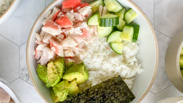Gather the ingredients for a California roll bowl