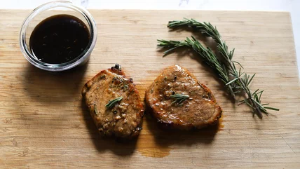 While the pork chops are cooking, place the saucepan with marinade on the stove over medium heat, simmering for about 10 to 15 minutes or until the liquid has reduced by about half. Once cooked, allow the pork chops to rest for five minutes, then slice the meat and serve it with sauce.