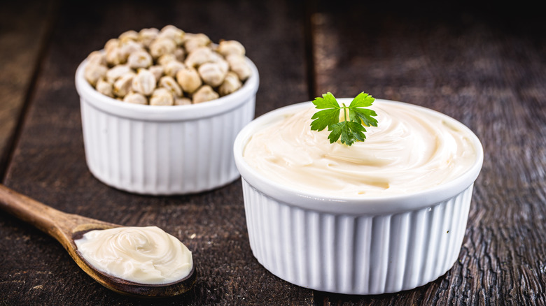 Another surprising way to use the liquid from canned chickpeas is to make vegan condiments like mayonnaise. You can do this by utilizing an immersion blender, which turns the aquafaba and vegan ingredients into an emulsified smooth, creamy mayo. But the mixture does require a few other ingredients to give it a similar flavor to traditional mayonnaise.