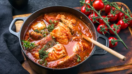 This recipe for Pouhn-Pa is a Laotian poached fish dish mixed with charred and smashed vegetables served over rice. The black bass is poached in a flavorful broth made from the fish head and bones, kaffir lime leaves, lemongrass, and galangal root. Meanwhile, eggplant, chiles, garlic, jalapeños, and shallots are charred in a skillet before getting mashed with a mortar and pestle. All of these components are combined and served over rice for a delightfully funky, slightly spicy meal.