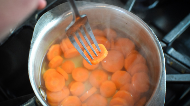- While the potatoes are cooking, peel and rinse the carrots. Cut the carrots into ¼-inch slices. Add the carrots to a small pot, and cover with about 1 inch of water. Cover the pot and bring to a simmer, then cook, uncovered, for about 3 to 5 minutes, or until the carrots are fork-tender. When the carrots are done cooking, drain and add to a large mixing bowl.