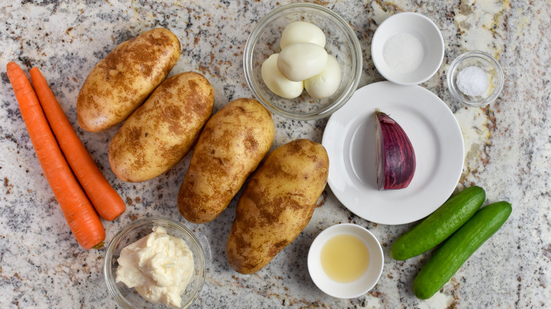 For this recipe, you'll need russet potatoes, carrots, Persian or English cucumbers, a red onion, apple cider vinegar, kosher salt, sugar, hard-boiled eggs, and mayonnaise. Easy enough, right?
