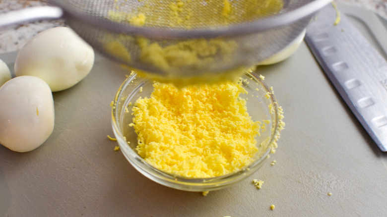 - Cut two of the eggs in half and remove the yolks. Press the yolks through a mesh sieve to finely grate the yolks and set aside.