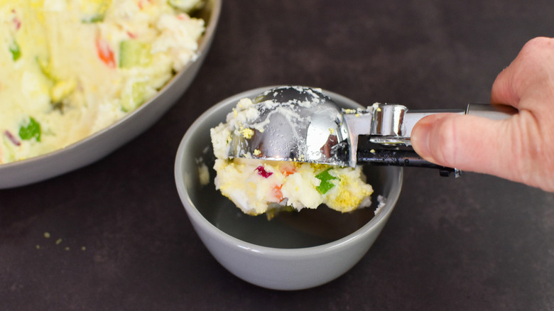 And that's it! Your Korean potato salad is done and ready to eat. Serve the potato salad with an ice cream scoop, and top it with the grated egg yolk. Rapone recommends serving this dish with gochujang chicken wings or even karaage. This potato salad should last a couple days in the refrigerator, but Rapone says it might need a little TLC after day 1: "I have noticed that the dressing seems to lose it's punch and found I needed to add a little more mayo, sugar, and vinegar to wake it back up on day 2."