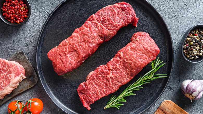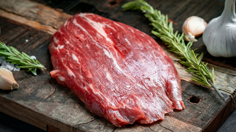 Flat iron steaks are available in rectangular shapes similar to flank steaks, but their thickness is uniform (via Food Fire Friends). This makes for a more even cooking best suited for the backyard grill. While flat iron steaks contain more fat, flavor, and better texture, their cost reflects such. While a flat iron steak is nowhere close to the most expensive there is, it will cost more than comparable cuts like its predecessor on this list.