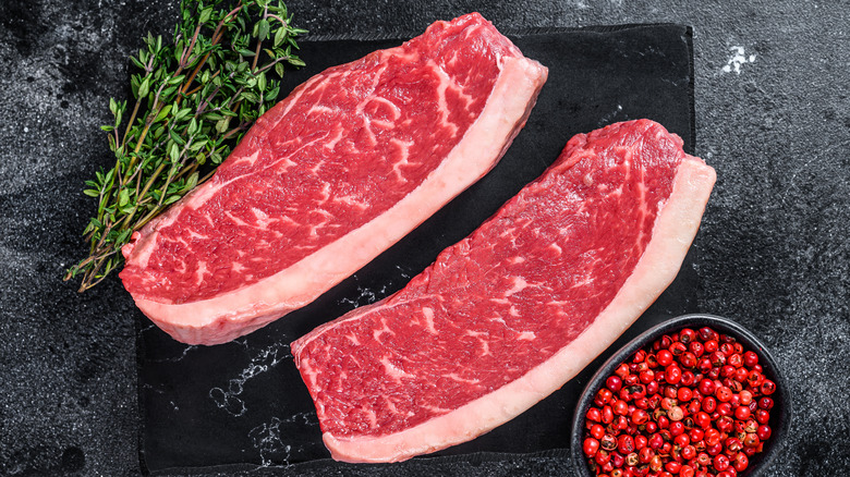 Ribeyes are cut directly from the ribcage of the cow. According to My Chicago Steak, the copious amounts of fat on the rib cage provide a depth of flavor completely unparalleled by any other cut of steak. Not only is the ribeye surrounded by flavorful fat, it's marbled by it end to end. This fat melts down and opens up the fibers of the ribeye, allowing it to absorb all of the flavor brought to life by your ripping hot stovetop skillet. Ribeyes can be available on the bone (Tomahawk) or boneless. Either way, there is no lack of decadence.