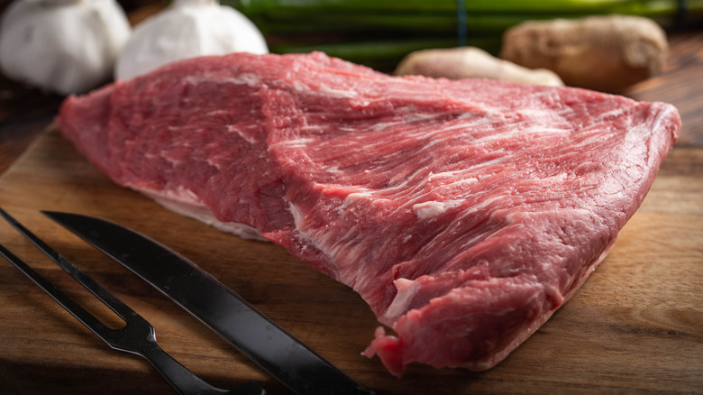 The tri-tip comes from the tri-tip roast, which is cut from the bottom, leaner portion of the sirloin, per Taste of Home. This triangular shaped cut is at its best when over high heat and to an internal temperature below medium. Although the bottom sirloin is generally tough and muscle-y, the tri-tip comes from the part of the bottom sirloin that usually includes specks of fat and marbling. The fat content is not high, however, so seasoning and cooking method is key (via Better Homes & Gardens).