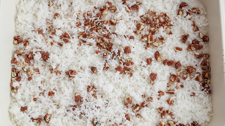 Add a crunchy layer of coconut flakes and pecans to a baking dish