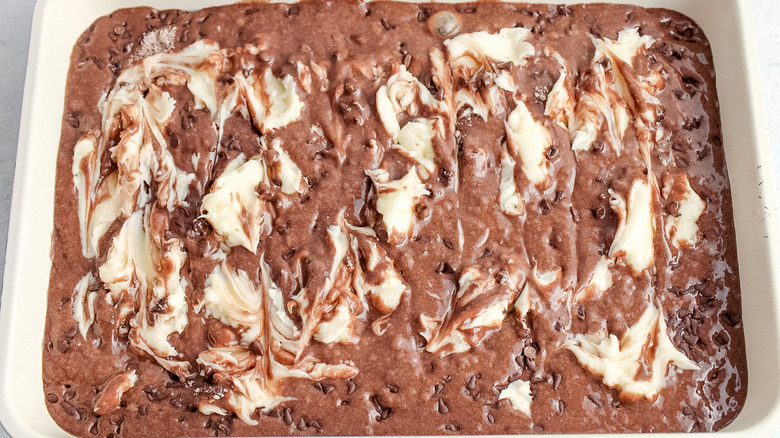 - Drop dollops of the cream cheese mixture over the cake batter. Use a knife to swirl the cake batter and cream cheese mixture together.