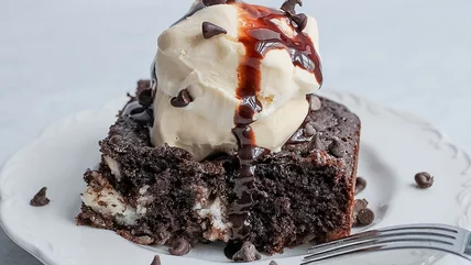 Once the cake is done baking, allow it to cool, then cut it into slices and serve. Morone recommends topping the cake with ice cream or whipped cream, though she also has some other suggestions. "Instead of ice cream or whipped cream you could just sprinkle some powdered sugar on top, or serve it without anything on top," she says. "The cake is so rich it really goes well with something lighter and creamier to balance the flavors." With each bite you take, you'll likely notice all of the cracks in the cake, a delicious reminder of exactly what makes this dessert an earthquake cake!