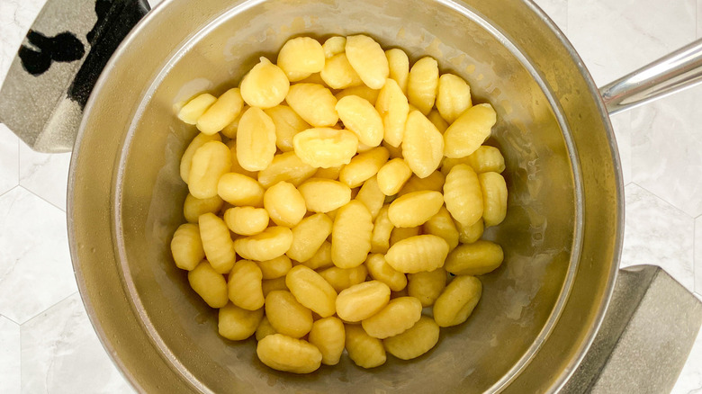To start this recipe, cook the gnocchi according to the package instructions. Once it's done cooking, drain the excess water, and MacLean suggests adding a little bit of olive oil to the cooked gnocchi to keep it from sticking together. You can set the gnocchi aside as you move on to the other steps.