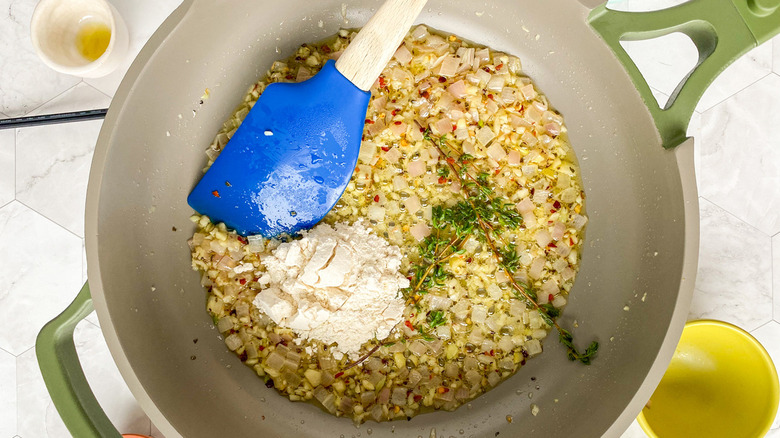 Place a large skillet over medium heat and add the olive oil and butter. Once those have heated up, add the shallot and garlic — which should be diced and minced, respectively — and cook them for 1-2 minutes. Now, add in the thyme, oregano, and red pepper flakes, if you're opting to add any. Finally, add in the flour and give everything a stir.