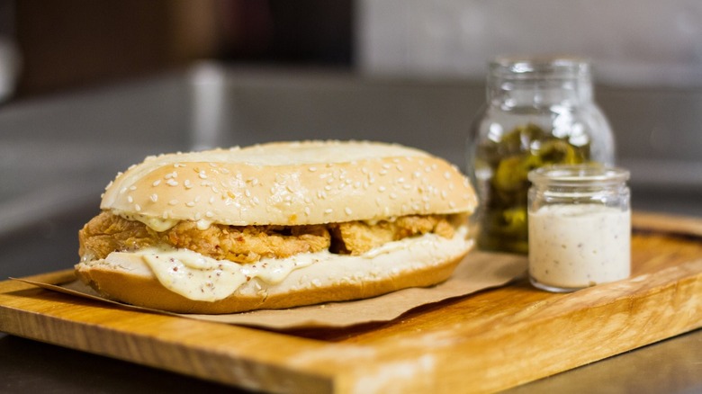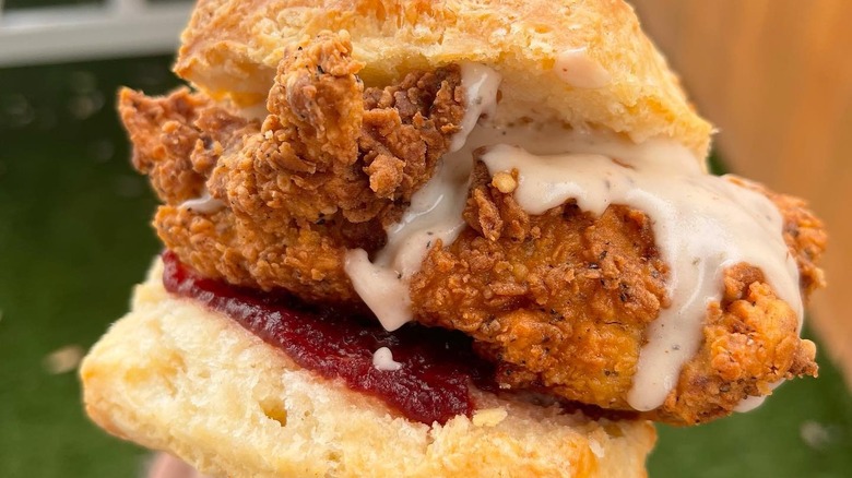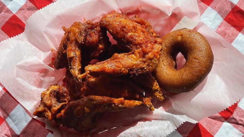Most of the places on this list serve classic bone-in chicken, but Bird Bird Biscuit is a little bit different. This Austin, Texas, favorite, which opened in 2018, is known for fried chicken sandwiches served on giant, light-as-a-cloud biscuits (via KVUE Austin). It's so good, and so beloved by people in its home city, that it earned the number five spot on Yelp's 2022 list of the top restaurants in the U.S. The menu has three chicken sandwiches including the Queen Beak, which comes with hot black pepper honey and bacon-flavored mayo. The combination of sweet, spicy, and smoky flavors all on top of a slab of fried chicken impressed The Infatuation, which recommended, "If you're only getting one sandwich, it should probably be this one."