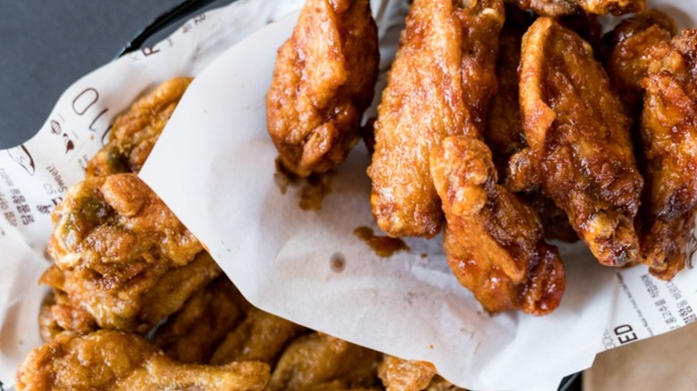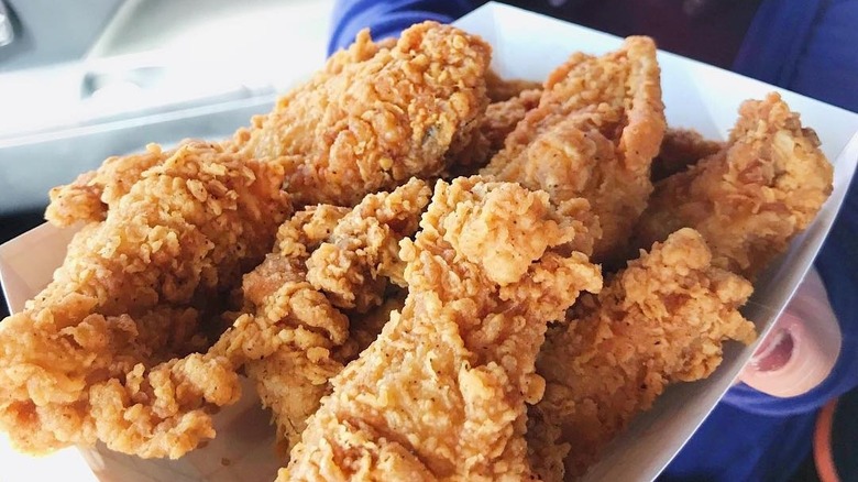 It might be called Federal Donuts, but the fried chicken wings and tenders are the real star of the show at this small chain of Philadelphia restaurants from chef Mike Solomonov. An intense amount of thought went into every stage of the chicken cookery (via Eater). It's dry-brined overnight, which seasons the chicken all the way through. The chicken is then dipped into a batter made from flour, corn starch, and water. Next, each piece is fried until it's just cooked through. Then, the chicken is fried again to make the outside shatteringly crisp. (This double-frying technique is indebted to Korean fried chicken.) Finally, the chicken gets tossed in either a dry seasoning blend or a glaze.