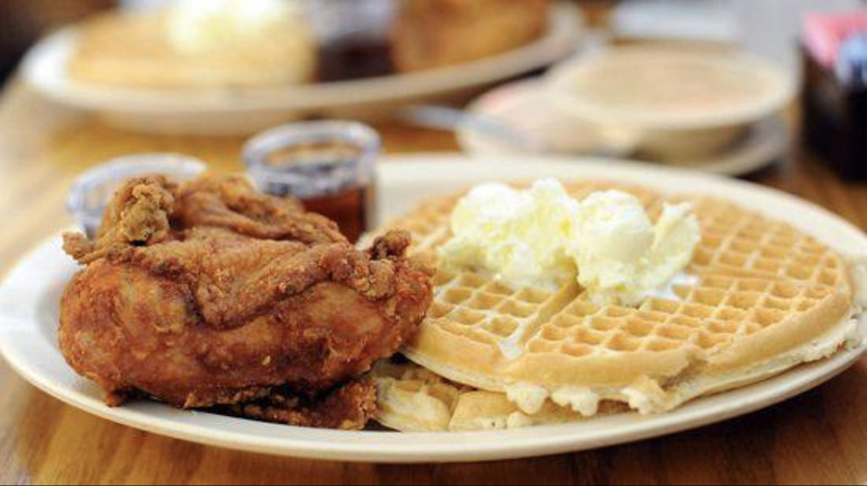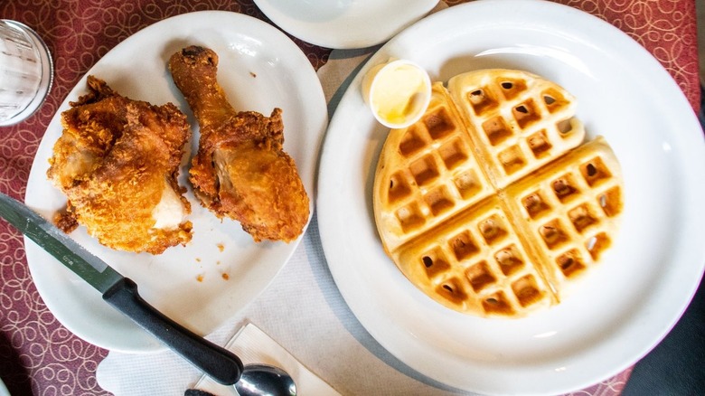 The illustrious pairing of fried chicken and waffles offers every indulgent, craveable flavor you could ever want packed onto one plate. It's fried, crispy meat with a bunch of buttered carbs, and you pour maple syrup and hot sauce over the whole thing. Essentially, the dish is everything that's great about America.