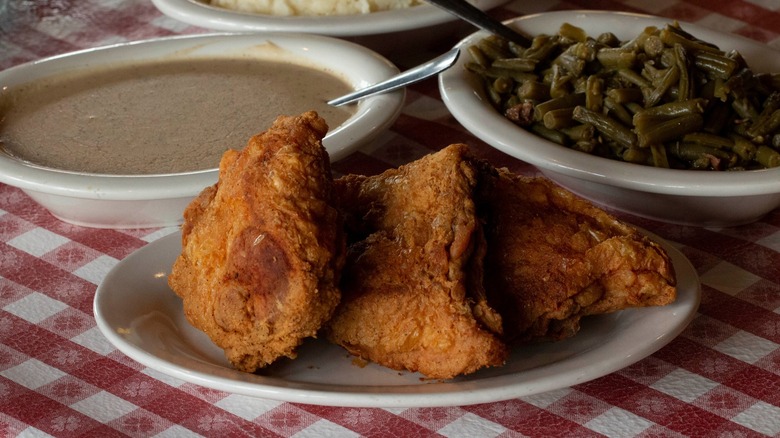 The chicken here has crunchy, thick breading, more like Popeyes than Gus's. However, despite this, it's not sodden with grease. Don't worry: It's not dry either. The Old Country Store's chicken is just an excellently-executed bird, with all of its components working together in harmony. If you don't trust us, take Alton Brown's word for it. During an episode of "Feasting on Asphalt," the Food Network star declared that it's "the best fried chicken I've ever had in my life, without question."