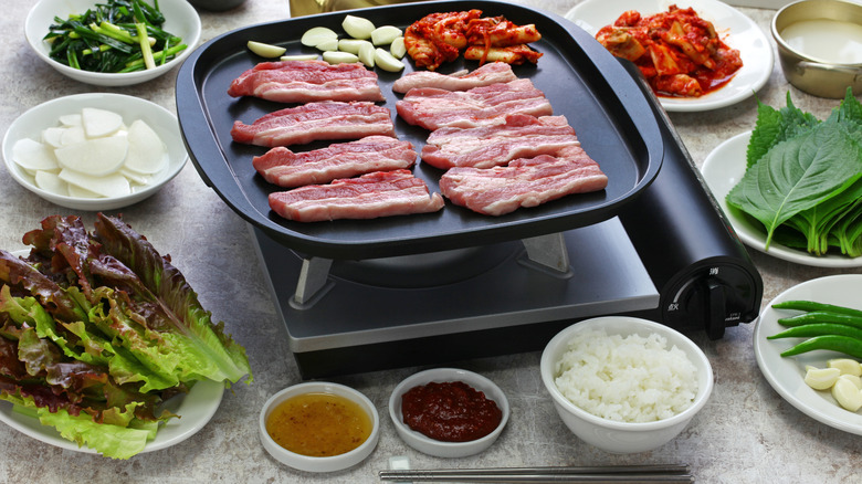 One of the most obvious ways in which Korean barbecue differs from the American version is the actual grill. Instead of a giant heavy-duty appliance on wheels, the grill is typically tabletop style. Consequently, it's an indoor activity — though you'll want to be sure to have all the windows open or opt for a smokeless grill if you're doing it at home.