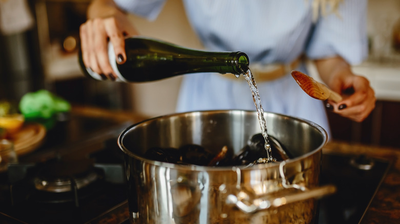 You may think you can add wine to your dish at any point in the cooking process, but that's not the case. When you add your wine depends on what you're cooking, but a good rule of thumb to follow is this: Don't add your wine too late, per What's Cooking America. If you're about to serve your dish, adding a big glug of wine at the last minute can give your dish a harsh quality. You don't want your food to taste like it's infused with alcohol, so What's Cooking America recommends 10 minutes to let the wine cook down and burn off those less-than-desirable flavors.