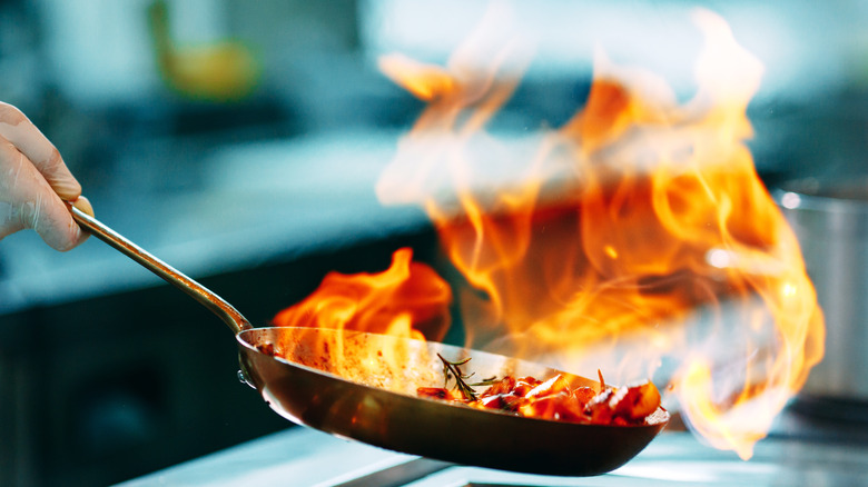 If you're looking to flex your kitchen skills, you may be interested in trying your hand at flambéing a dish. Haven't heard of this technique before? It's when alcohol is added to your pan and then set on fire to produce a burst of flames (via What's Cooking America). The flambé can be dangerous, so you'll want to be careful (and turn off your heating element) before you get started. To flambé a dish, you'll add alcohol to the pan to give the flame something to burn. Guidance from What's Cooking America says this technique adds a deep liqueur flavor to your food. However, according to Good Housekeeping, you may be disappointed to find out that you can not use wine to flambé a dish.